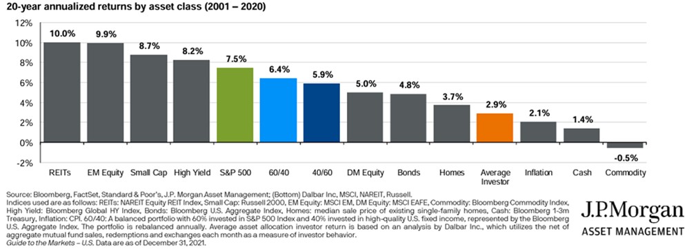 Many believe that the most impactful factor in determining your return is your investment selection (which stocks and funds you buy). This is not true. Investor behavior is the most important factor and the most significant driver of underperformance. See the chart below showing annualized returns by asset class from 2001 to 2020. The average investor is shown in orange.