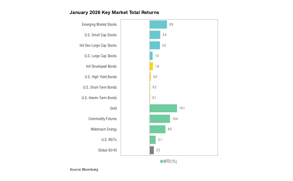 - U.S. large-cap stocks gained 1.5% in the first month of 2026 while U.S. small-cap stocks rose by 5.4%. U.S. intermediate-term bonds were flat, rising by a modest 0.1%.