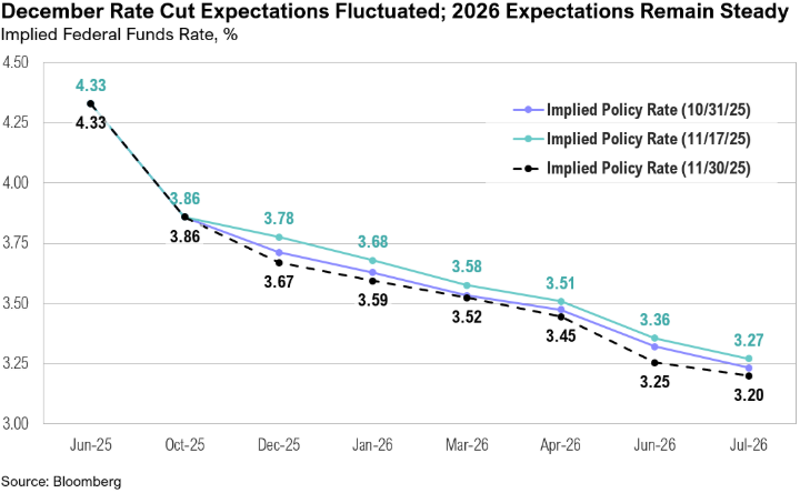 Notably, 2026 rate-cut expectations remained relatively stable. Markets are pricing in the equivalent of two quarter-point reductions next year—one of which is expected before Powell’s term ends in May.16 At the December 9 FOMC meeting, the Fed will release projections for year-end 2026 rates.