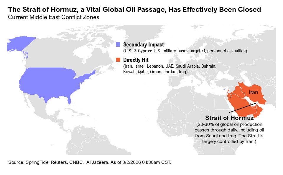 • A joint U.S.-Israeli strike killed the Iranian Supreme Leader and other senior officials over the weekend, prompting Iran to retaliate across the region and effectively close the Strait of Hormuz. Markets reacted in the expected risk-off fashion, with oil and gold prices surging while equities sold off.