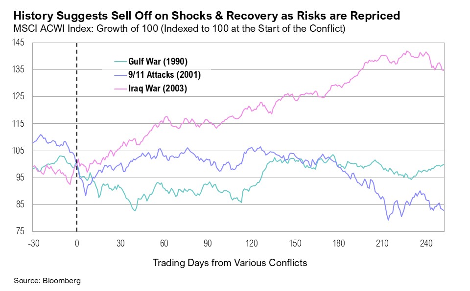 • History shows markets often sell off at the onset of conflict but recover as uncertainty clears, with the 1973–74 oil embargo the notable exception due to its sustained, structural inflation shock.